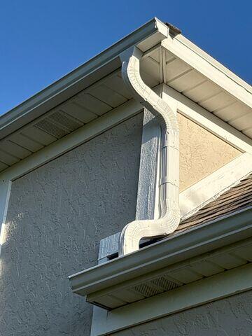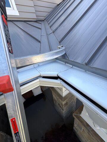 To complete the job, we reinforced the downspout strap for added stability, applied a roof sealant repair, and installed additional second-story gutters. We also took an extra precaution by laying a protective sheet where the soffit meets the roof to prevent future under-soffit leaks.